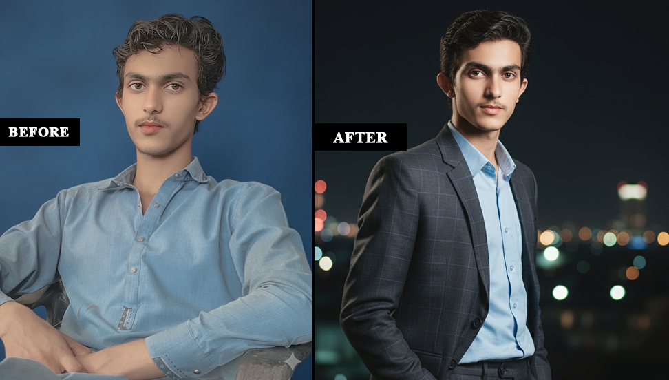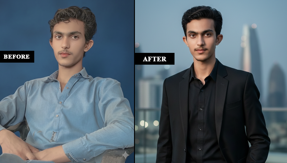 Prompt : Transform the uploaded photo of the person into a photorealistic, street-smart, stylish boss look. Dress them in a sharp, fitted black suit with matching pants and shirt, with subtle urban attitude elements: rolled-up sleeves, open collar, sleek shoes. Pose: standing confidently, one hand in pocket, slight smirk, leaning casually, showing full swag and dominance. Accessories: stylish watch, sunglasses optional, subtle jewelry. Background: blurred city streets, neon lights, or modern rooftop for cinematic urban vibe. Ultra-realistic lighting, high-resolution, cinematic shadows, detailed textures on fabric and skin. The final image should scream confidence, power, and street-smart attitude, like a real-life hero or boss.